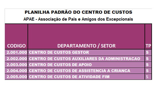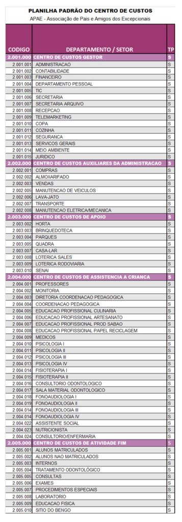 O Centro de Custo de Atividade Fim está relacionado com o propósito da existência da entidade APAE, relacionado a missão propriamente dita, a prestação dos serviços com excelência. Todos os outros centros de custos só existem em função da atividade fim da entidade. Isso porque, como declarado anteriormente, não é possível que empresas possam cumprir com seu propósito ou atividade do contrato social, sem obter uma estrutura que dê o suporte para os diversos outros setores em que a atividade exige, serviços de gestão, serviços auxiliares e de apoio.