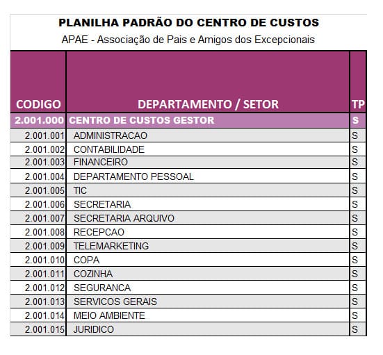 O Centro de Custo Gestor é o topo da piramide. Nele está alocado todos os departamentos de gestão da entidade. Lembre-se que não há possibilidade de exercer a atividade fim, sem exercer as atividades que atecedem a ela, ou seja, as atividades meio – de apoio e auxiliares (centro de custos de assistência à criança, centro de custos de apoio, centro de custos auxiliares da administração e centro de custo gestor).