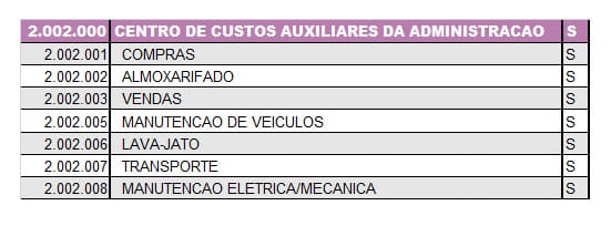 O Centro de Custo Auxiliares da Administração são responsáveis pela logística das atividades do Centro de Custo Gestor. Sendo assim, cuidam das compras, do almoxarifado (materiais, estoques), das vendas (quando se aplicar), da manutenção de veículos, transportes, manutenção elétrica e mecânica do patrimônio.