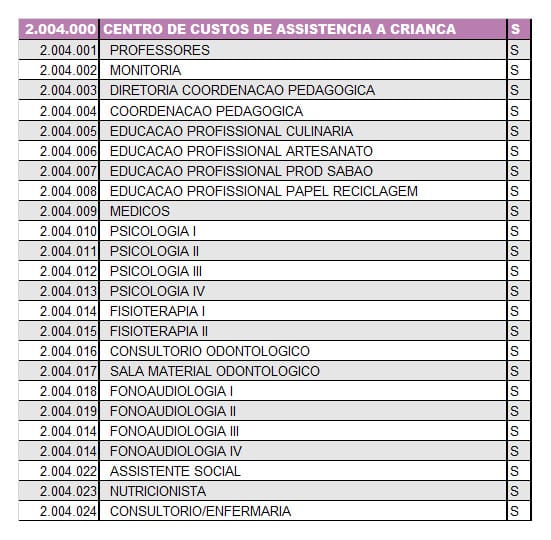 O Centro de Custo de Assistência à Criança tem relação direta aos centros indispensáveis para que a instituição possa cumprir com seu propósito. Está relacionado ao suporte psicológico, psicopedagógico, professores especializados, médicos, profissionais da culinária, artesanato, fabrica de sabão, reciclagem, psicólogos, fisioterapeutas, dentistas, fonoaudiólogos, assistente social, nutricionista, consultórios e enfermaria. São os considerados centros essenciais e que demandam a fatia maior dos custos.