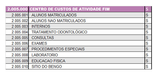 Código: 2.005.000 - Departamento/Setor: Centro de Custo das Atividades Fins