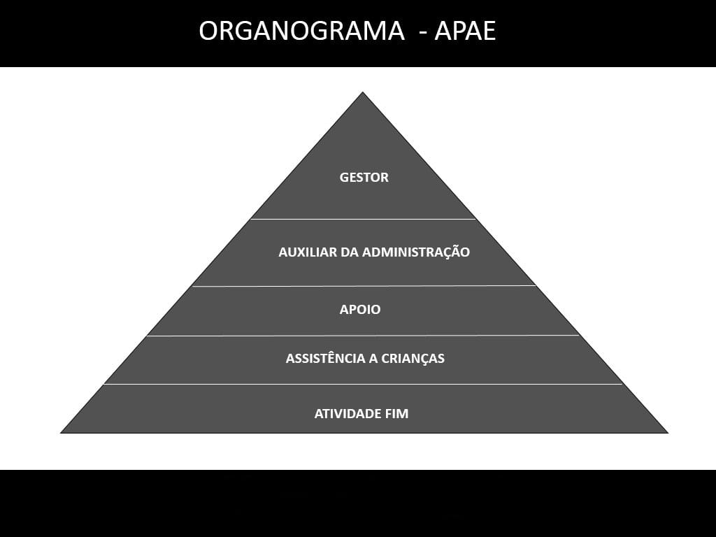 Somente para esclarecer! A hierarquia é pressuposto na disposição da pirâmide, onde o topo é a alta administração e a base, a atividade fim da entidade, onde se encontram os alunos excepcionais matriculados, não matriculados, os assistidos na CASA-LAR (espaço que tem como objetivo oferecer a pessoas carentes – crianças, adolecentes e idosos, a possibilidade de aprofundar e vivenciar a experiência completa de família e o suporte adequado a eles), dente outros.
