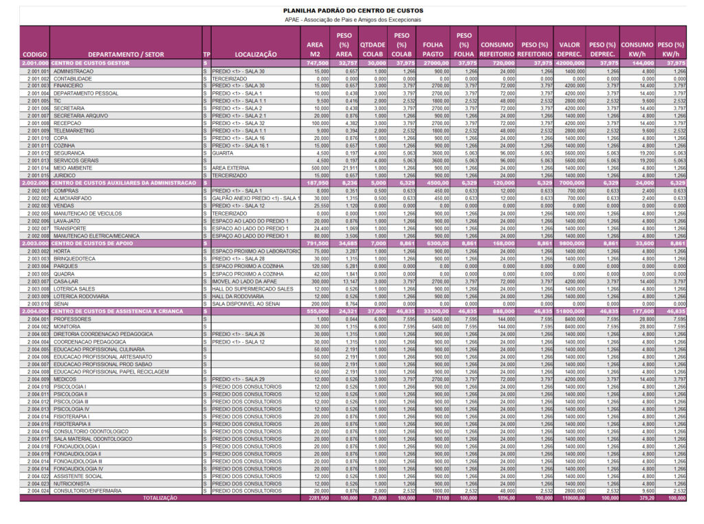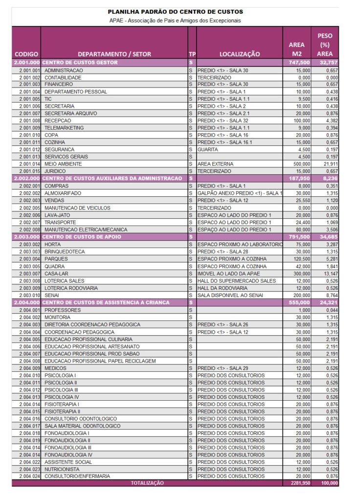 Esta coluna é preenchida automaticamente e não deve ser alterada. Ela representa o peso deste centro em relação a área total (*).
