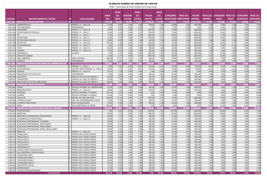 A partir de agora, neste artigo Centro de Custos – Parte II, vamos estender a planilha em colunas. Este processo, nos dará a possibilidade de determinar critérios de rateio, levantar e definir parâmetros de cálculos para determinar a participação dos centros nos custos, definir como serão tratados os centros e como a planilha deverá se comportar.